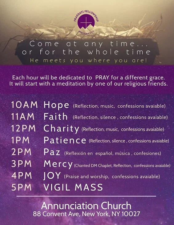 Frassati Fellowship of NYC invites you to a Day of Adoration. Come and spend time with Jesus this Advent to prepare your heart to receive Him! We are going to have a full day that starts at 10am with Exposition of the Blessed Sacrament and ends after a 5pm Vigil Mass. At the beginning of every hour, one of our religious friends is going to lead a meditation as we pray for God's graces. Throughout the day, we are going to have praise & worship music, time for silent prayer, and the opportunity for receive the Sacrament of Reconciliation.
